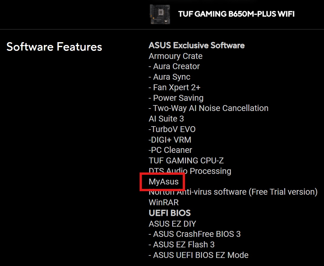 根據TUF GAMING B650M-PLUS WIFI官網規格頁面"Software Features"中的資訊,可確認該型號主機板支援MyASUS;而PRIME H310M-K則未標註此功能。